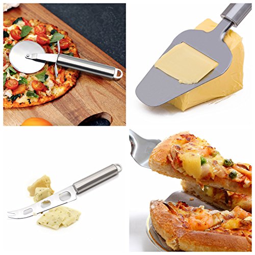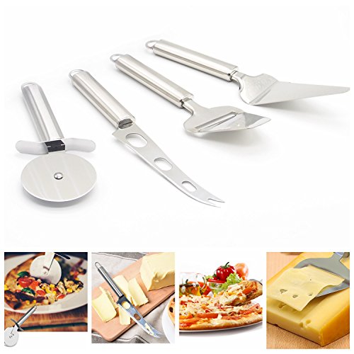 DAWILS 4 pcs Kitchen Gadget Tools Set is the best addition to your kitchen for a simpler and classier dining experience. Cheese Slice, Pizza Cutter, Cake Serve and Cheese Knife serve your cheese, pies, cakes, and butters with sleek stylish accessories. Each tools is made of premium stainless steel and is suitable for your favorite pies, cakes, butter, and cheese. Whether you are a casual cheese eater or a gourmet food connoisseur, you can count on this 4-piece knife set to enjoy even more your favorite cheeses or pizza with friends and family, and be able to display them at home, at a party or use them on the go or at a picnic. Key Features and Benefits: 1 Easy to Clean, Dishwasher Safe 2 Sturdy stainless steel blade and handle 3 The most compact and polished design for Kitchen Gadget Tools Set ; elegant box, perfect for a gift 4 Easy and simple to handle, guard your fingers and 100% safe. 5 Cake server features a serrated edge for easily cutting slices of pie, cake, and brownies. No need to switch back and forth between a knife and a spatula: this handy tool has two functions in one 6 Pizza wheel features a sturdy, stainless steel cutting blade which slices through the thickest pizza crust with ease, and an angled wheel that offers optimal comfort and performance. The built in finger and thumb guard provides additional safety. 7 Cheese knife is specially designed with a unique open surface blade and a lifetime sharp serrated edge. The open surface blade reduces friction and keeps food from sticking. Particularly suited for all types of cheese to produce a perfect slice, thick or thin, every time. Also ideal for fruits and vegetables. 8 Cheese slicer has a thin, flexible blade and a sharp cutting edge, you can easily cut fresh, thin slices with even more flavor. Included: Pizza cutter *1 Cheese knife*1 Cheese slicer*1 Cake serve *1 0
