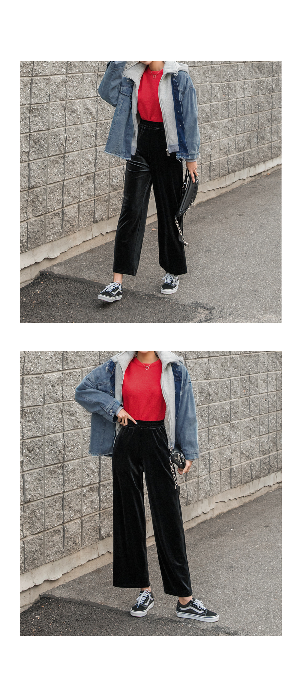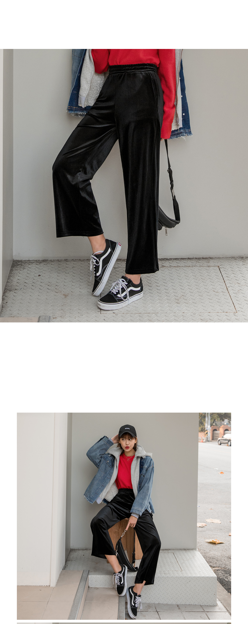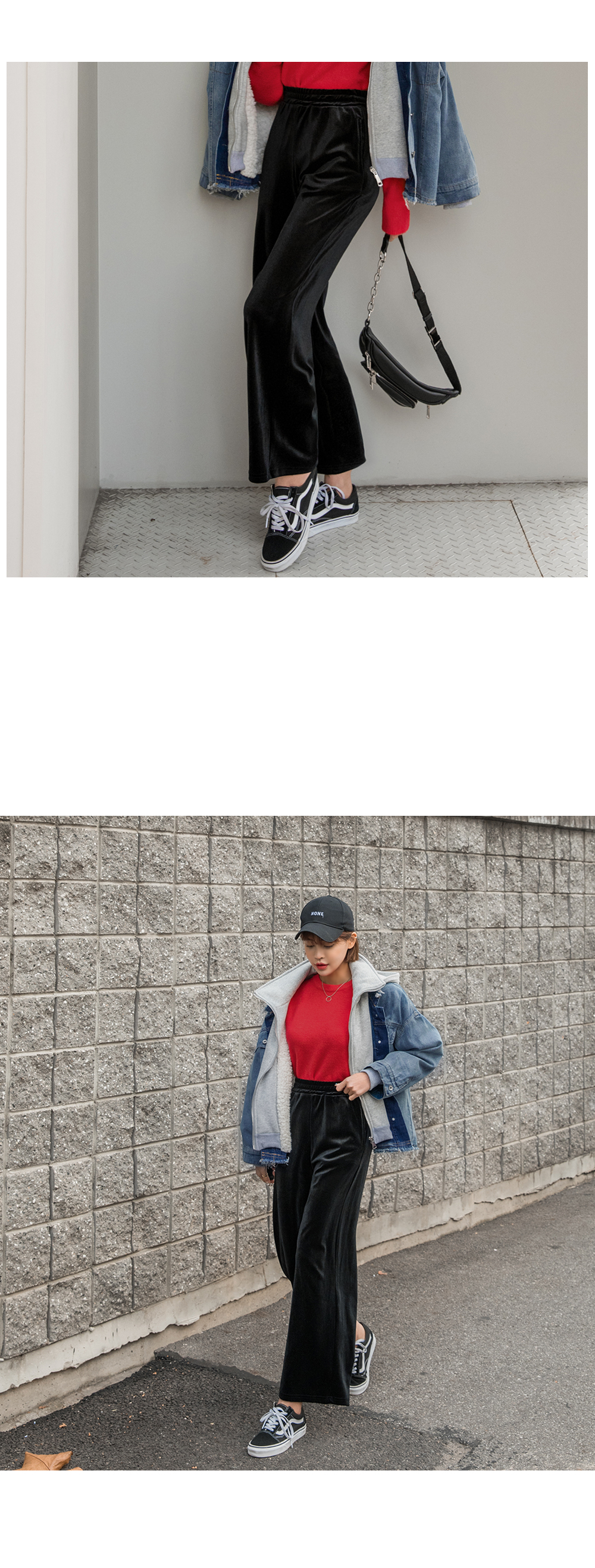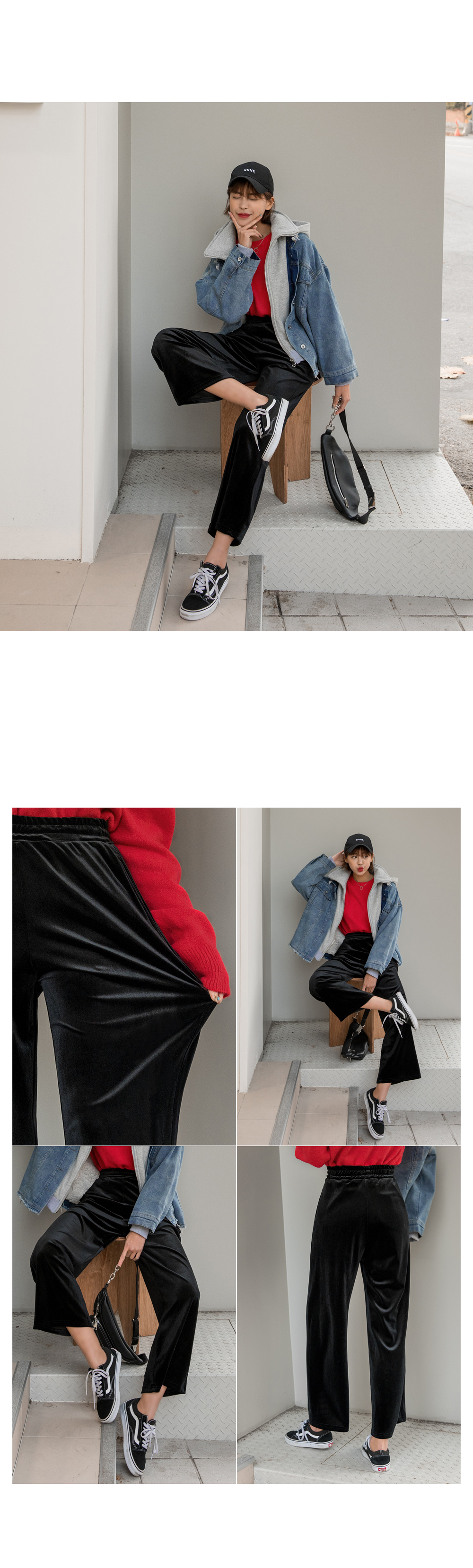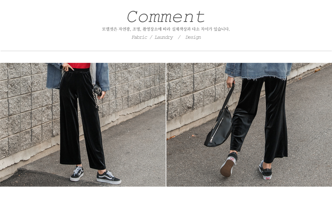 와이드한 핏감이 시크하고 매력적인 벨벳팬츠에요.