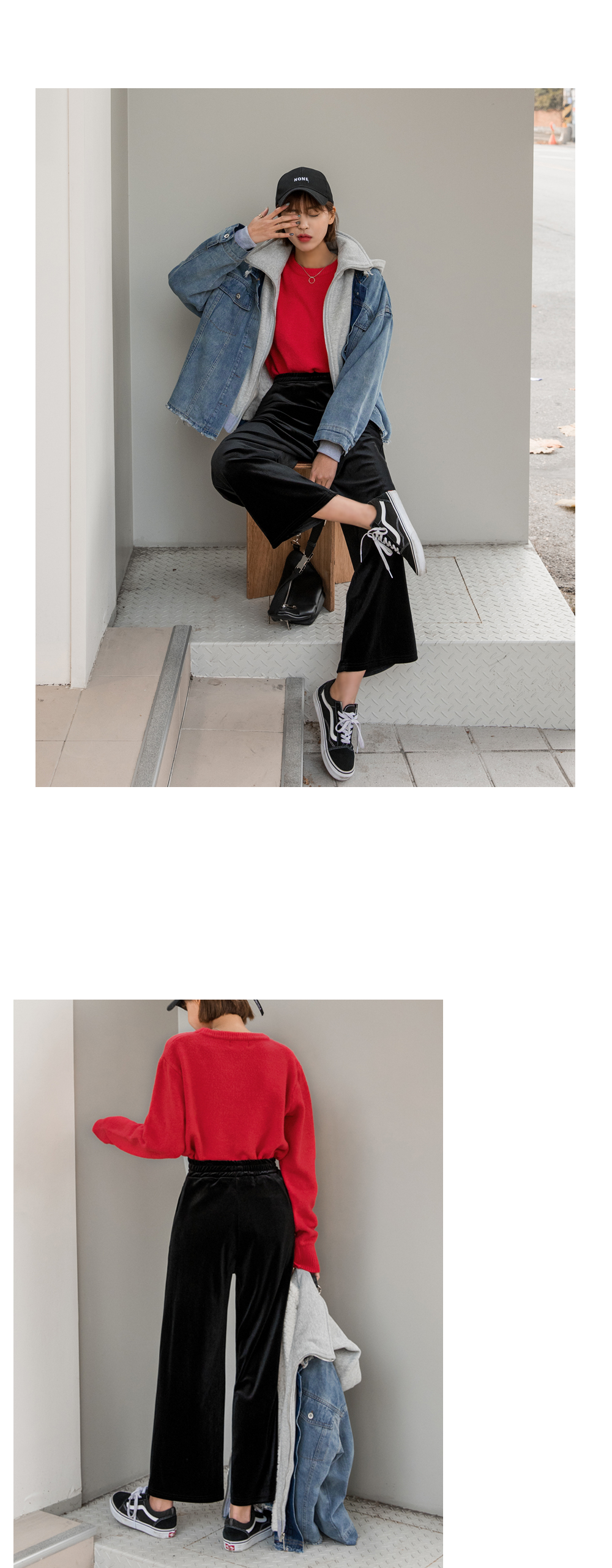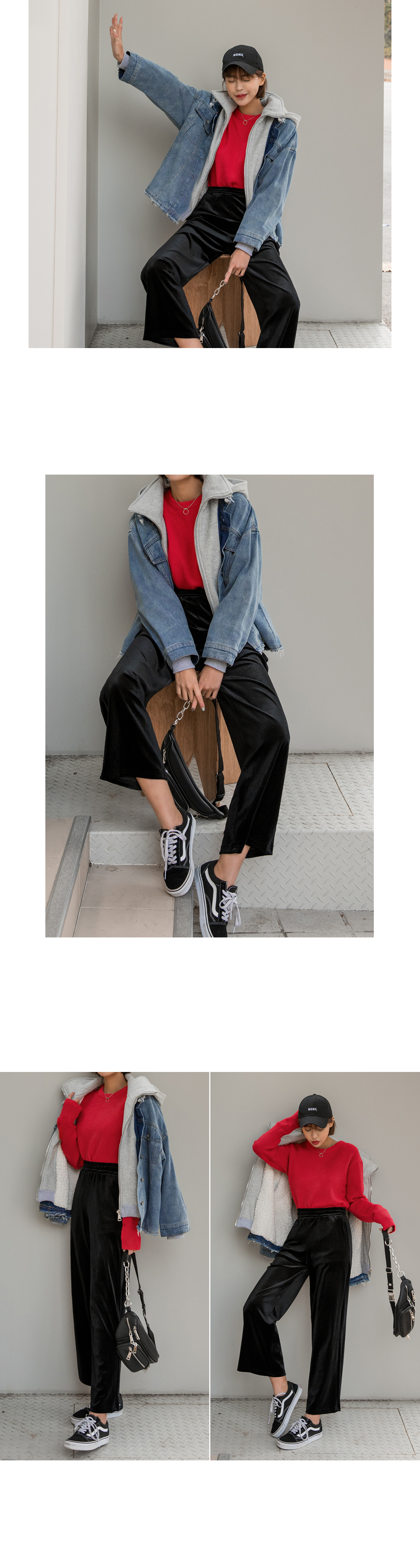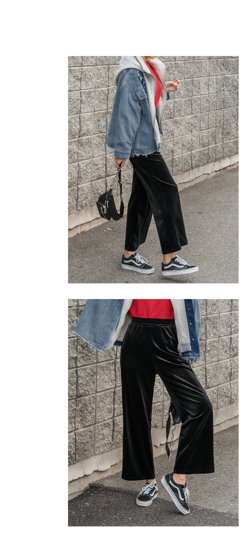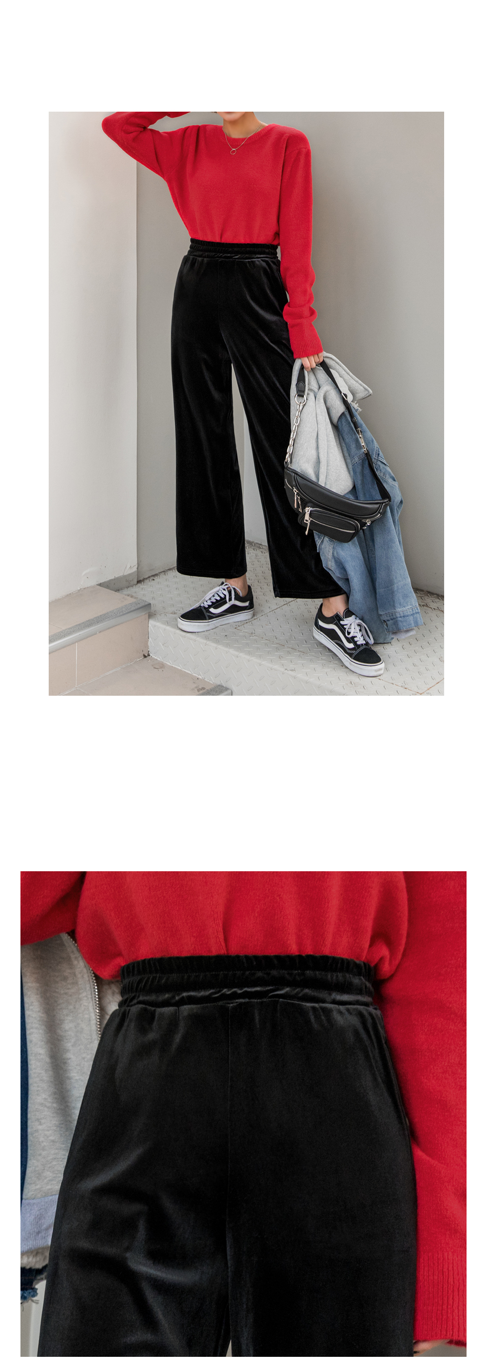 와이드한 핏감이 시크하고 매력적인 벨벳팬츠에요.