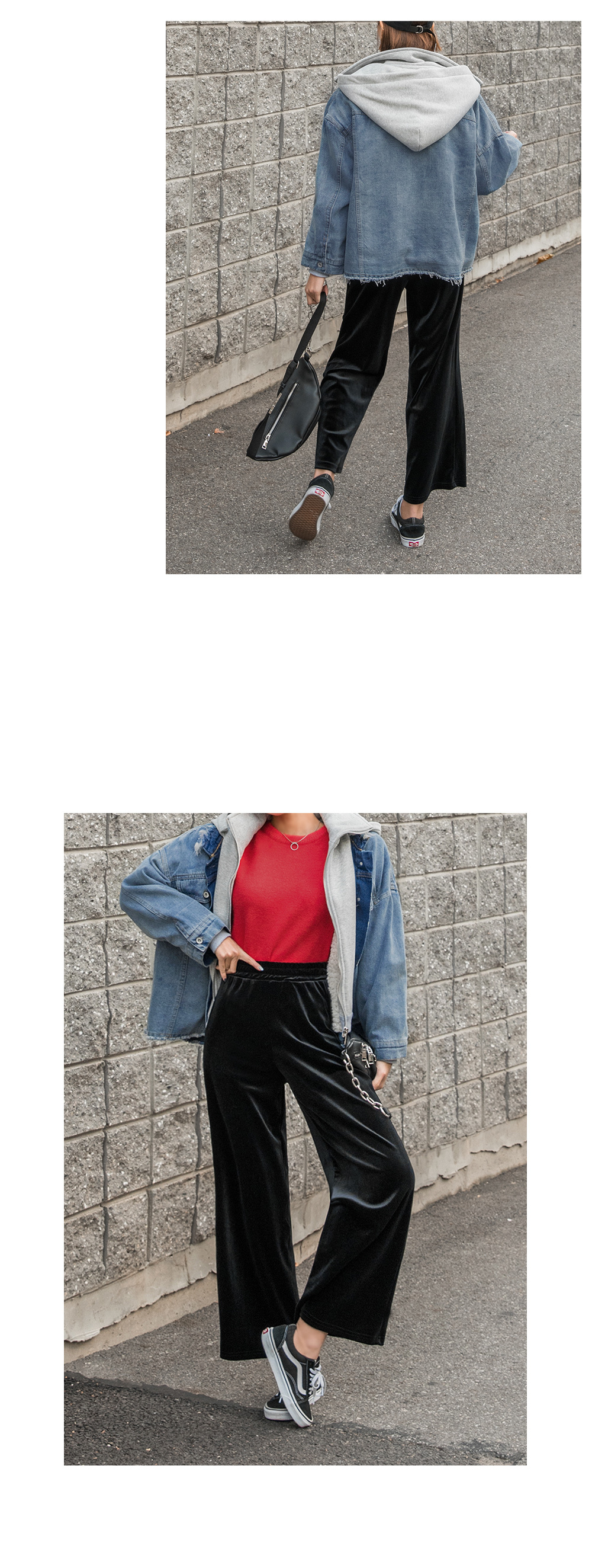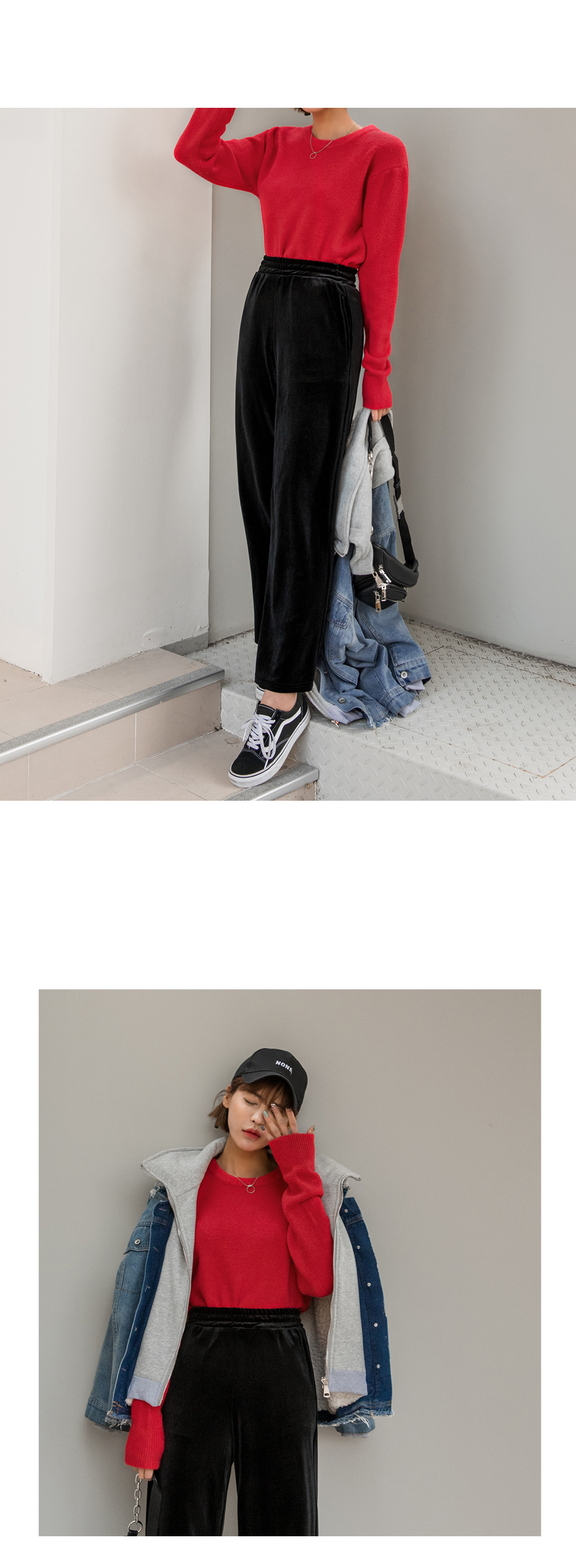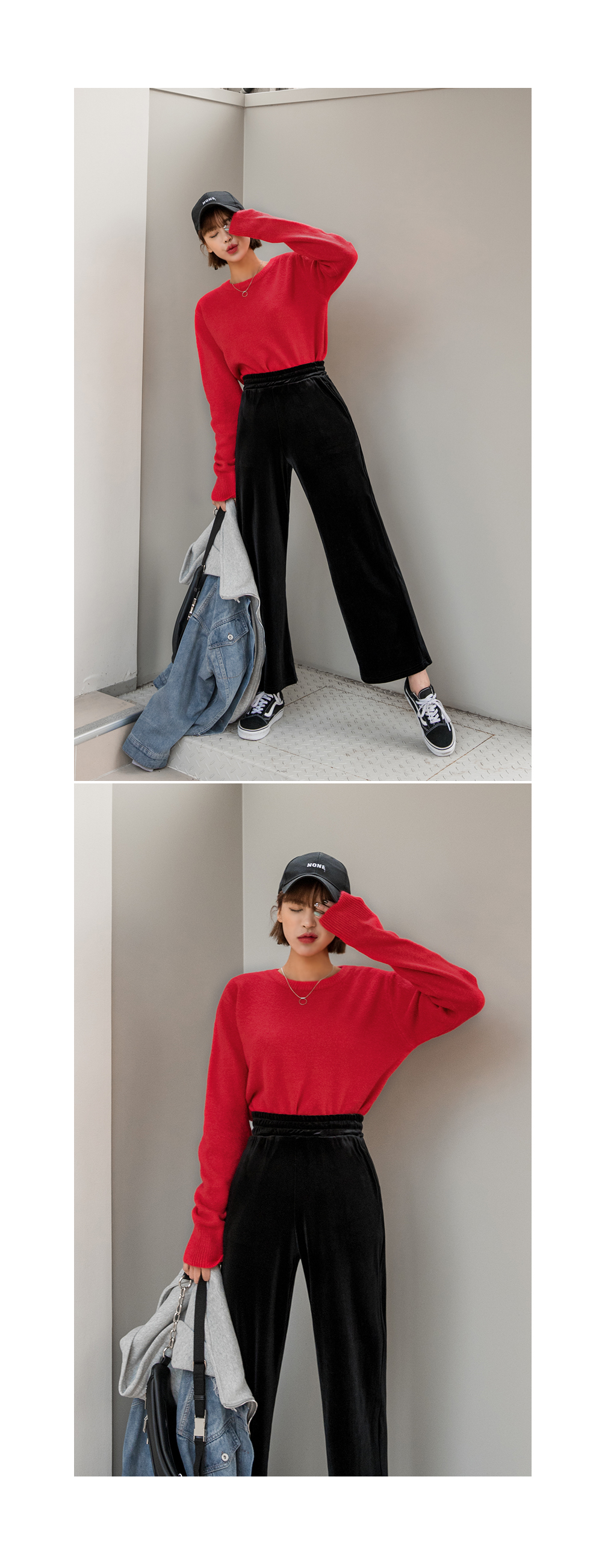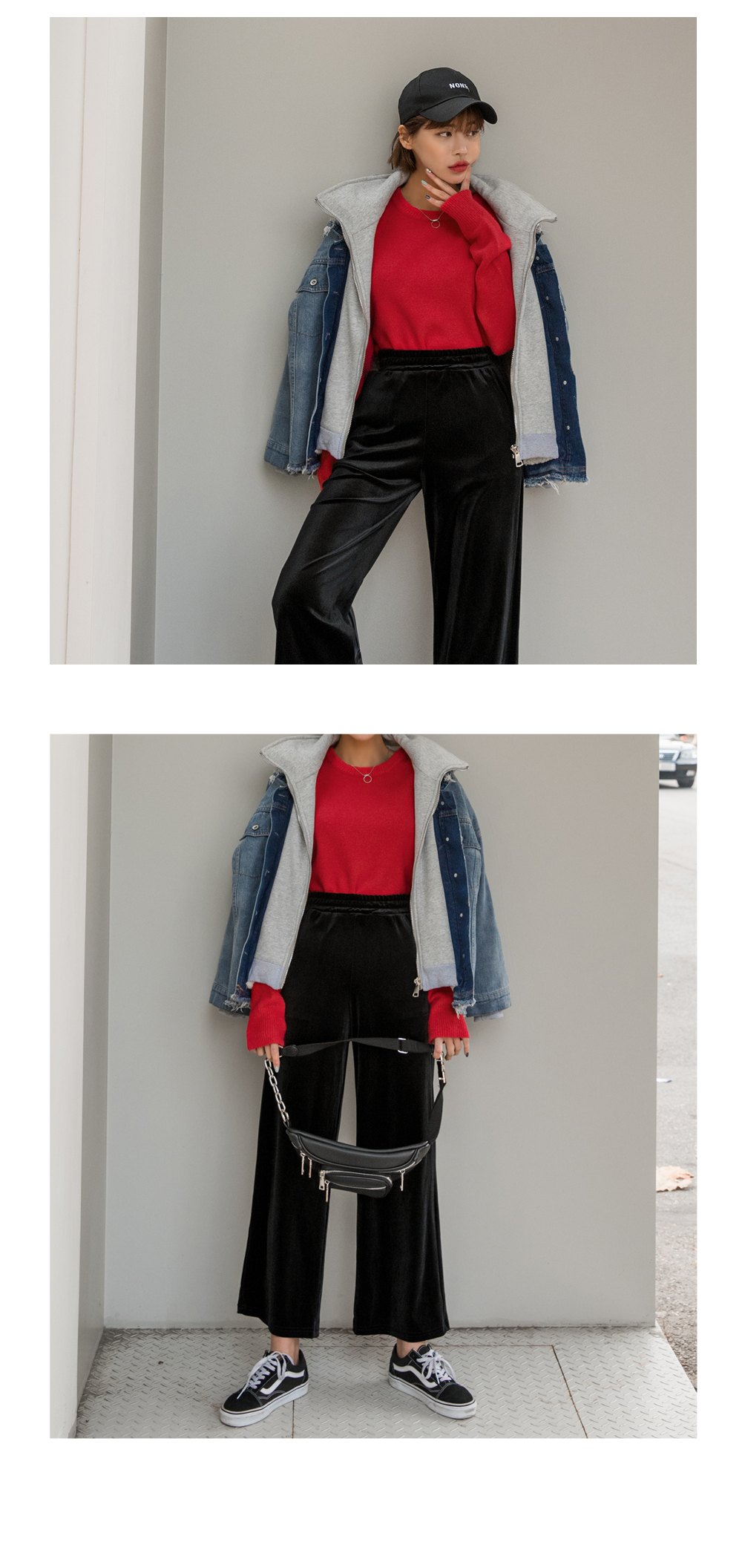 와이드한 핏감이 시크하고 매력적인 벨벳팬츠에요.