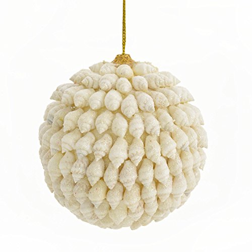 - Features a ball shaped ornament covered in white seashells with glitter accents