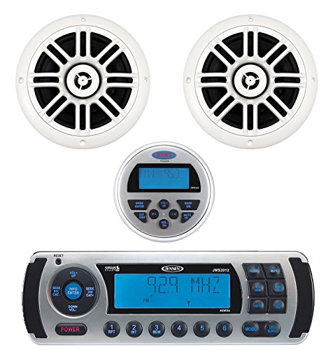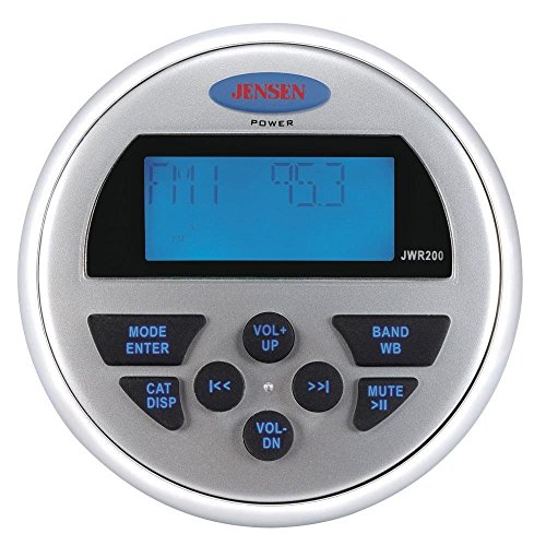 - Feature : Package Includes: 1 Jensen Stereo 1 Pair Of Spekaers 1 Jensen Remote / Waterproof (IPx5) faceplate, Blue LED backlighting, Electronic AM/FM tuner (US/Euro selectable), RBDS with PTY search, NOAA 7-channel weather band, iPod ready (requires iPod interface control cable, sold separately), Sirius7reg; satellite radio read / EQ presets (flat, rock, pop, classical, user settings), Conformal-coated circuit boards, UV resistant: ASTMD4329 compliant, Corrosion resistant finish ASTMB117 compliant, Max output power: 40W x 4160W total, Low battery alert, Standard DIN chassis, R / ensen JWR200 Waterproof Wired Remote Control with Display, Functions with Jensen marine JMS series stereos only, Waterproof full display remote with blue backlight, Includes 19 feet extension cable, Mounts in 2.75 inches hole with spin-on retaining ring / 6.5" , 2-Way Marine Speakers - 150W - White Ultramodern, Cutting-Edge Styling with Strong, Clear Audio. These 6.5" Round Coaxial Speakers are UV and Water Resistant and Deliver Up to 150 Watts of High Quality Sound. The Integrated Grill Assembly Simplifies Installation. Features: Color: White 2 Pair 2-Way Speakers 150 Watt 6.5" UV and Water Resistant Round Coaxial Speakers
