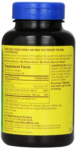 -. Binding : Health and Beauty -. Brand : Nature Made -. EAN : 4600514211051 -. Feature : Helps build strong bones and teeth / Helps support healthy muscle contraction / Small size softgel -. IsAdultProduct : 0 -. Label : Nature Made -. LegalDisclaimer : ***EXPIRATION DATE = 6/2016*** IN NO EVENT, REGARDLESS OF CAUSE, SHALL ALL STAR SALES BE LIABLE FOR ANY INDIRECT, SPECIAL, INCIDENTAL, PUNITIVE OR CONSEQUENTIAL DAMAGES OF ANY KIND, WHETHER ARISING UNDER BREACH OF CONTRACT, TORT (INCLUDING NEGLIGENCE), STRICT LIABILITY OR OTHERWISE, AND WHETHER BASED ON THIS AGREEMENT OR OTHERWISE, EVEN IF ADVISED OF THE POSSIBILITY OF SUCH DAMAGES. ALL STARS SALES HOLDS NO LIABILITY FOR ANY DAMAGES OR PROBLEMS FROM USE OF ANY PRODUCTS SOLD, AS WE ARE A THIRD PARTY SELLER. ALL PRODUCTS MUST BE USED AS DIRECTED AND AT YOUR OWN RISK OF RESPONSIBILITY. -. Manufacturer : Nature Made -. MPN : F9-537R-XARP -. NumberOfItems : 1 -. PackageQuantity : 1 -. PartNumber : F9-537R-XARP -. ProductGroup : Health and Beauty -. ProductTypeName : HEALTH_PERSONAL_CARE -. PublicationDate : 2012-07-27 -. Publisher : Nature Made -. Size : 180 -. Studio : Nature Made -. Title : Nature Made Calcium Petites 200 Mg with Vitamin D Softgels, 180 Count -. UPC : 031604028343