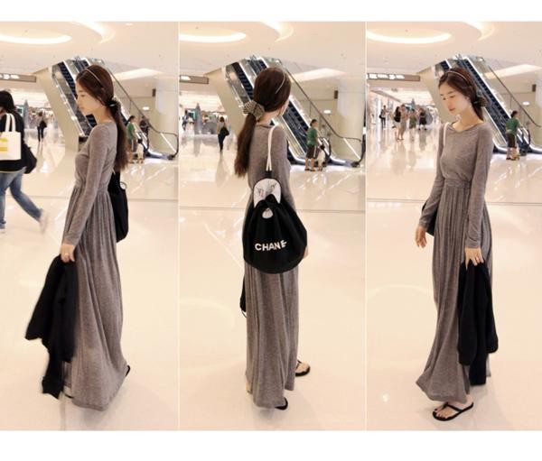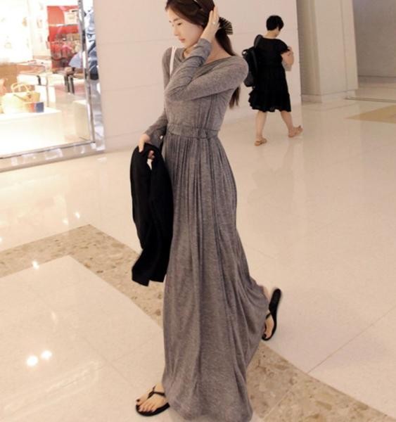 長袖コットンドレス プリーツスカート マキシワンピース グレー/ FREE