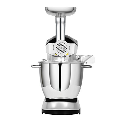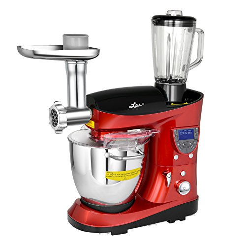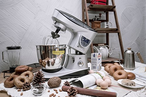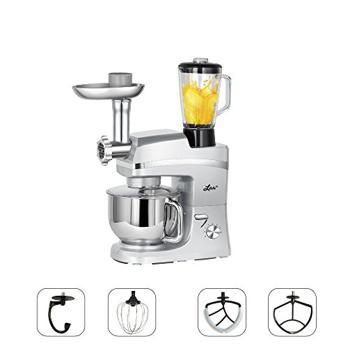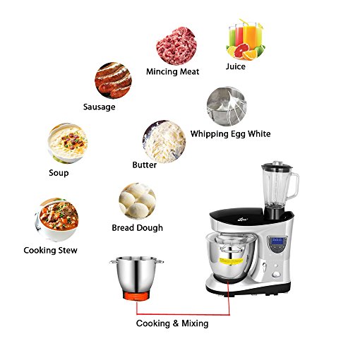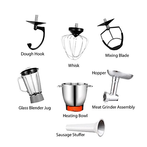 AWESOME VERSATILITY: This multi-functional chef machine comes with multiple useful attachments that a stand mixer could ever have: dough hook, mixing beater, whisk, 1.6 quarts/1.5L glass blender jar, meat grinder and sausage stuffer. BPA free splatter shield cover that is safer and easier to add ingredients while mixing makes it just even better!