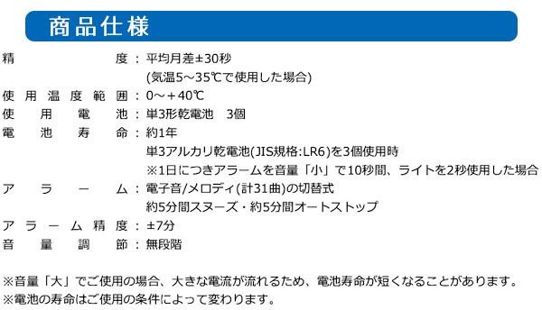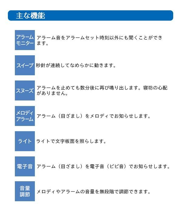 31曲のメロディアラームを贅沢に搭載!!毎日違う曲を鳴らすパターンや、気分に合わせた曲調を順に鳴らすパターン、お気に入りの1曲に固定するパターンなどが選べます。 |