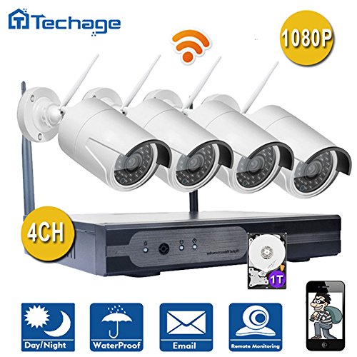 Techage Wifi Security Camera System/ Wireless CCTV System Outdoor/ Indoor, 4CH 1080P 2.0MP Waterproof IP Camera, 65ft Night Vision, Plug & Play, Home Security Surveillance Kits With 1tb Hard Disk