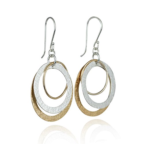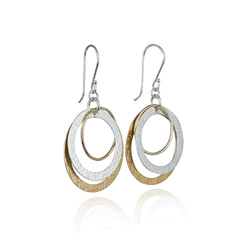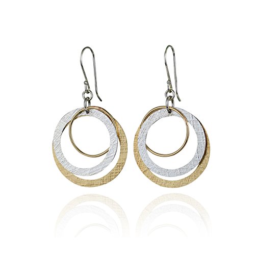 Impressive multi circle two tone dangle earrings. 925 Sterling Silver and 14k Gold Filled graduated hoops earrings. Each earring is made with a polished yellow Gold Filled hoop measuring about 3/4" in size, a textured Silver flat circle measuring about 1" in size and a large yellow Gold Filled flat circle measuring just under 1 3/16" in size. Artisan handmade.