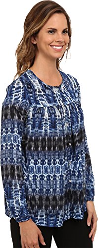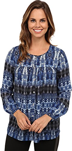 Inked rich blue print adorns this sweet billowy blouse, cut from sheer crepe fabric. Scoop neckline. Full button-front placket. Long sleeves with single-button cuffs. Straight hemline. 100% polyester. Dry clean only. Made in the U.S.A. and Imported.