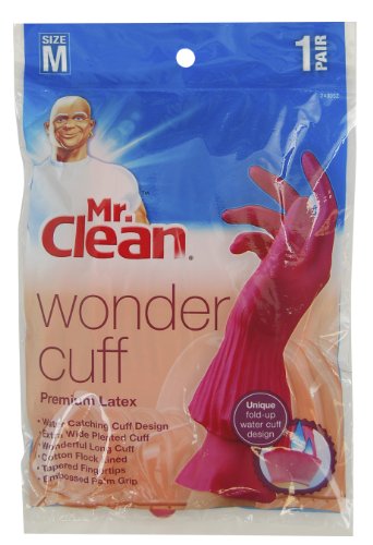Studio : Mr Clean Publisher : Mr Clean Binding : Misc. Product Description Mr. Clean Wonder Cuff Premium Latex Gloves features ribbed forearm that provides extra room to make donning easier as well as provide extra room to compensate for watch or bracelet. The unique 13" long cuff design can be turned up to catch drips and the cotton flock lining adds comfort and helps absorb perspiration to keep hands dry. The embossed palm provides for a more secure grip while cleaning. Tapered fingertips allows for excellent tactile feel making picking up the smallest items effortless. The shimmery finish makes this glove stand out. Size Medium. 0