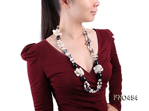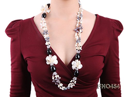 This unique style necklace consists of three strands of white 5x7mm pearl beads drilled in the ratio of three to seven,black 9x11mm,7x8mm pearl beads drilled in the ratio of three to seven,some white sector-shaped seashells,and black oval faceted 17x21mm agate beads