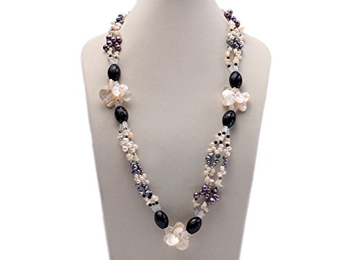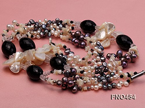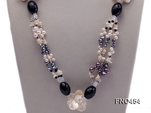 Description *This unique style necklace consists of three strands of white 5x7mm pearl beads drilled in the ratio of three to seven,black 9x11mm,7x8mm pearl beads drilled in the ratio of three to seven,some white sector-shaped seashells,and black oval faceted 17x21mm agate beads.