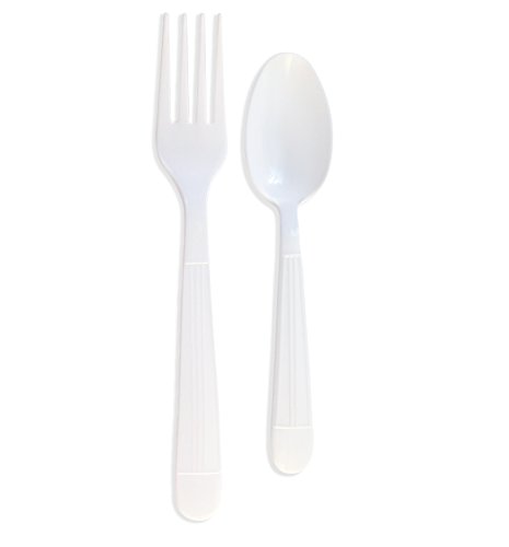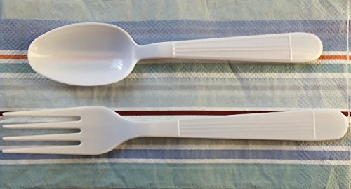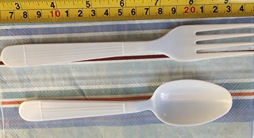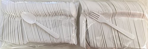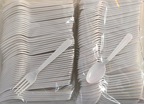Product Description Plastic White - 100 Plastic Forks - 100 Plastic Spoons - (200 Pieces) Disposable Plastic HEAVY DUTY - Strong Durable Construction GREAT FOR PARTIES - GATHERINGS - EVERYDAY USE. Fork Length is 180 MM And Width is 26 MM disposable cutlery set (100 forks - 100 spoons) 0