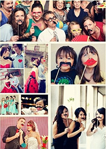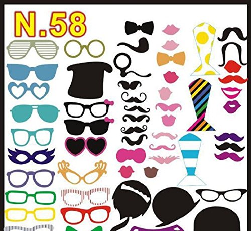 -. Feature : 58 pieces & props. Virtually limitless, creative combinations & options. / Easy DIY: Simply select whichever props you will be using from your 58 piece kit, and then glue or tape them to the wooden sticks (included). / Instantly put your subjects at ease; props give subjects an excuse to relax, be creative, and have fun. / Made of high quality cardstock with included wooden sticks, also stickers included / Unique and funny props included 18 glasses, 4 hats, 4 ties, 3 colourful neckties, 16 colourful Moustache, 10 red lips, 1 pipe, 1 crown, 1 Magnifier(cardstock)