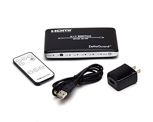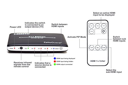Zettaguard 4K x 2K 4 Port High-Speed 4 x 1 HDMI Switch with PIP (Picture in Picture) and IR Wireless Remote Control. Use the HDMI switch to connect your game consoles, laptop, desktop, and other HDMI-compatible devices to your high definition television. It supports the latest generation of HD resolutions, which includes 1080p, 3D, and 4K. This Zettaguard HDMI switcher comes with an infrared remote to let you wirelessly switch between devices in PIP (Picture in Picture) display while being in the comfort of your couch.