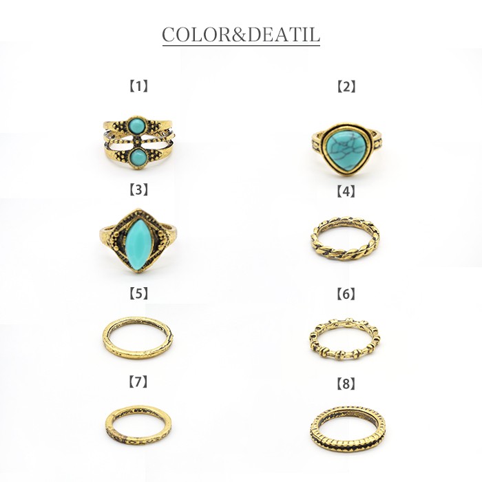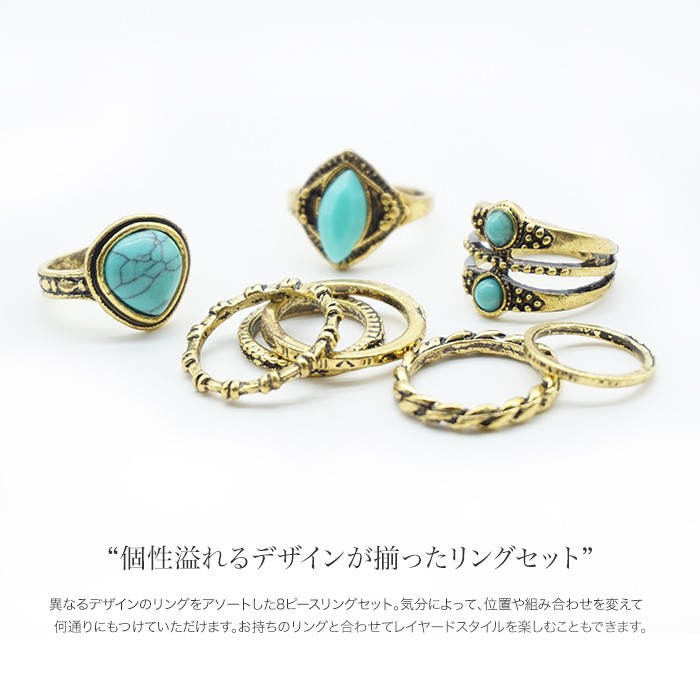 異なるデザインのリングをアソートした8ピースリングセット。気分によって、位置や組み合わせを変えて何通りにもつけていただけます。お持ちのリングと合わせてレイヤードスタイルを楽しむこともできます。