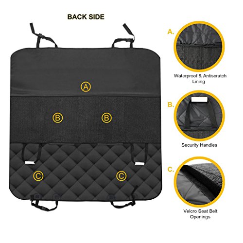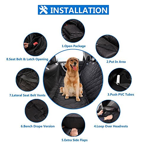 Here are the answers to your messy problem ? Waterproof and stain resistant, this Seat Cover has extra pockets for all those doggie necessities, like treats, travel bags and much more! ? This seat hammock is constructed with extremely durable polyester "canvas," with an underside made with an anti-skid mesh. ? Thanks to ingenious neoprene belts the two loose corners are solidly anchored to the seat ? Additionally, the clever headrest belt can be used to cross around the seat "shoulder" if the headrest is not available (usually on older cars). ? A great friend for the dog lovers in your life! Give them something they never expected, and something they will appreciate every time they take their furry friend to the park, vet, or just around town!