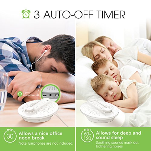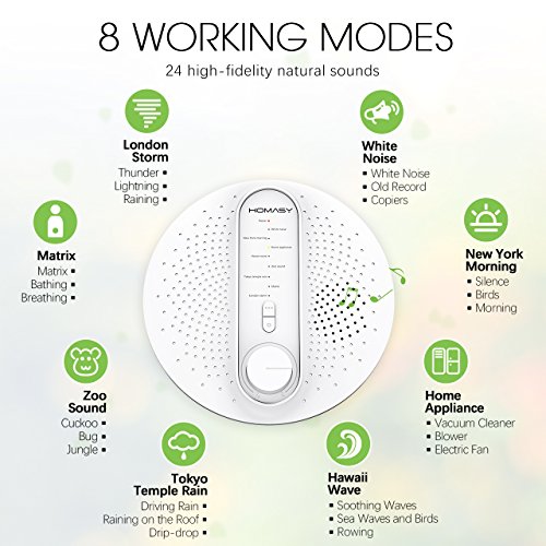Studio : Homasy Publisher : Homasy Binding : Health and Beauty Product Description Do you have trouble going to sleep? Is your baby easily woken up by the outside noises? Are you alaways travel and need a quick power nap? Take Homasy white noise machine home, helps you block out distractions and create an easeful environment for sleep, relaxation and conversation. Idea for the insomnia, babies, seniors, shift workers. Why choose us? ●Helps you sleep by blocking distractions ●Pacifies fussy and crying babies ●Increases focus while enhancing privacy ●Soothes headaches and migraines ●Masks tinnitus (ringing of the ears) ●Relaxes and reduces stress 8 WORKING MODES 24 HIGH-FIDELITY NATURAL SOUNDS White Noise (White Noise, Old Record, Copiers) New York Morning (Silence, Birds, Morning) Home Appliance (Vacuum Cleaner, Blower, Electric Fan) Hawaii Wave (Soothing Waves, Sea Waves and Birds, Rowing) Zoo Sound (Cuckoo, Bug, Jungle) Tokyo Temple Rain (Driving Rain, Raining on the Roof, Drip-drop) Matrix (Matrix, Bathing, Breathing) London Storm (Thunder, Lightning and Raining) 3 Auto-Off Timer to Conserve Energy While You Sleep 30mins Allows a nice office noon break 60mins or 120mins Allows for deep and sound sleep 2 Power Supply Modes Comes with USB cable, works with any international USB adapter, USB power outlet, computer/laptop USB port Take it on the go with 4AA batteries(Not included) Safety Guaranteed Fire-resistant material Non-toxic substance Approved by CE, FCC and RoHS Enjoys 45 days money-back and 12-month worry-free warranty. Portable Great for Travel This white noise sound device is small and lightweight. It fits into a bag or suitcase, making it a perfect travel companion during your travel. Specification Input: 5V USB Power, 1A Weight: 8.82oz Package Included 1 x White Noise Sound Machine 1 x USB Cable 1 x Carrying Bag 1 x User Manual 0