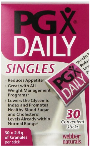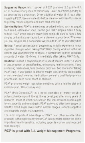 ReleaseDate : 2013-07-23 Studio : PGX Publisher : PGX Binding : Health and Beauty Product Description PGX Daily Singles contain unflavored PGX granules that can be mixed easily with moist foods or in water or juices. PGX Daily helps with weight management by helping you to feel satisfied sooner and thus eat less. Simply sprinkle on cereal, soups, yogurt, or salads, or "just add water" fora convenient way to control appetite. PGX Daily does not affect the flavor of your food. PGX granules support blood sugar balance already in the normal range and give you a feeling of fullness that lasts for hours.* PGX goes beyond fiber. It is highly concentrated and works by absorbing water to provide a feeling of satisfaction that curbs appetite and cravings.* PGX requires additional water to provide its full range of benefits. Always drink plenty of water when using any PGX product. 0