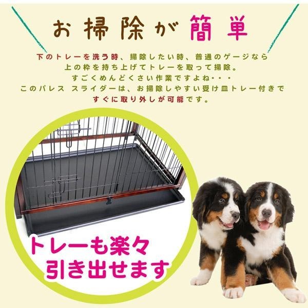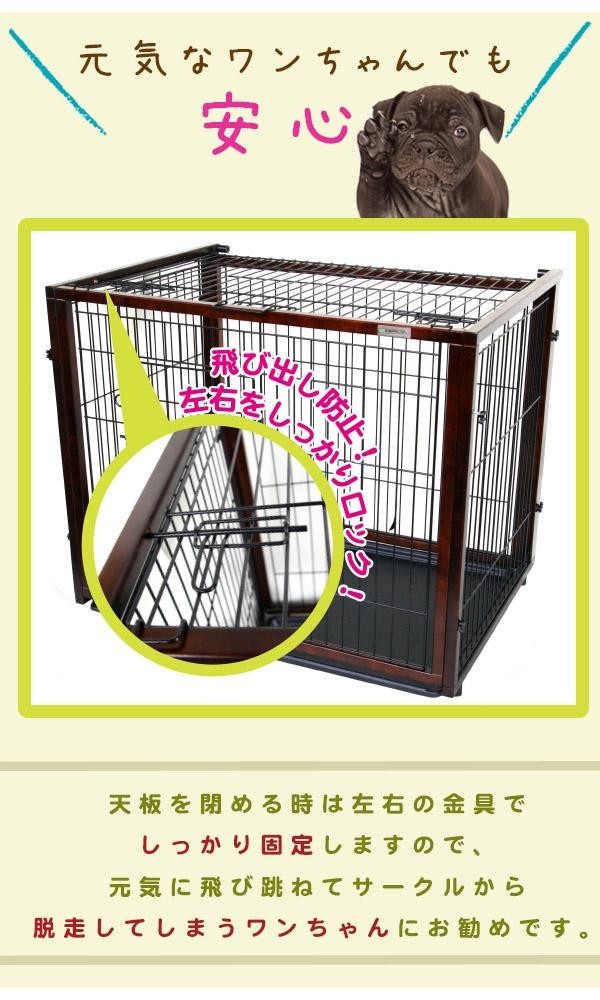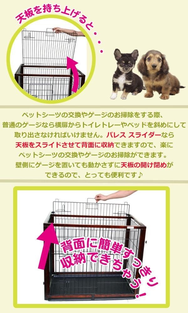 | 元気に飛び跳ねて脱走してしまうワンちゃんにもお勧めの天板付きサークル!!天板はスライドさせて背面に収納できますので、ペットシーツの交換やお掃除なども楽に行えます。 |