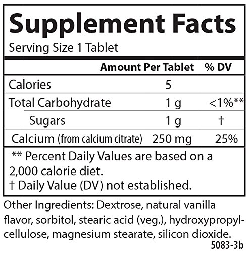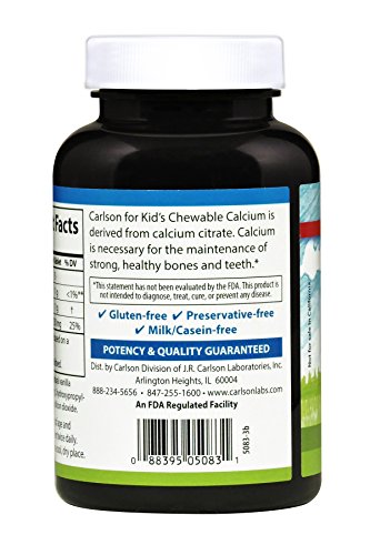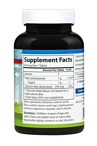 Calcium is necessary for bone and teeth formation, which is why the American Academy of Pediatrics recommends children ages 4 to 8 get 1,000 mg of calcium daily. These requirements increase in children ages 9 through 18 to 1,300 mg. Some of the best food sources for calcium include milk, yogurt, and cheese; however, many children don't reach the recommended daily dosage through diet alone, so a supplement can be a great option. Carlson for Kids Chewable Calcium provides 250 mg of calcium in a tasty vanilla tablet.Feature