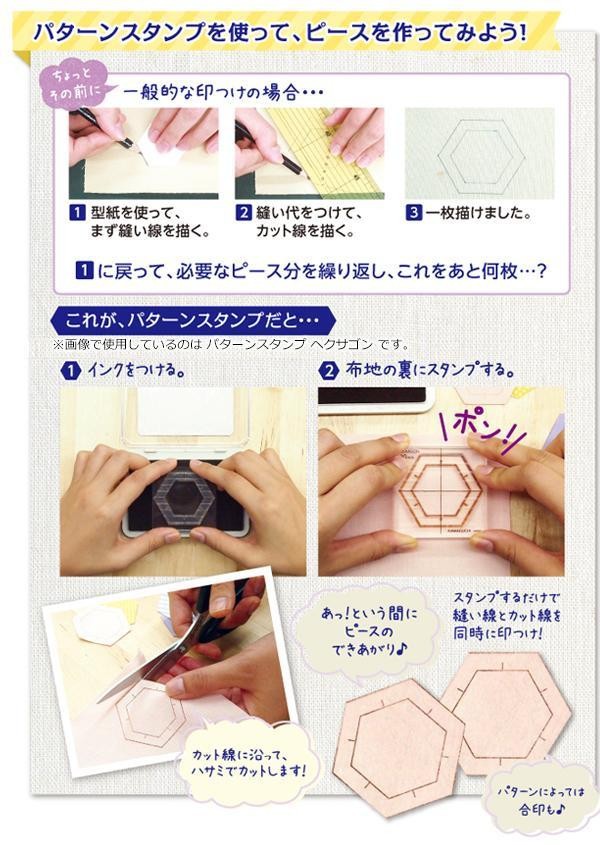 | 布地の裏にスタンプするだけで、縫い線・カット線の印つけが「あっ!!」という間にできます。しかも、キレイで正確!!パターンスタンプを使って、気軽にパッチワークをはじめましょう♪ |