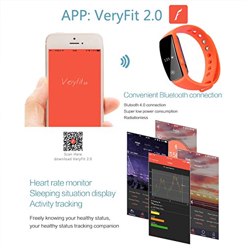 -. Feature : Heart Rate Monitor - Continues HR monitor, strap-free heart rate monitoring. A simple way to start with heart. TIPS: =>Fitness tracker will consistently monitor your heart rate every 5 minutes automatically even though the screen is OFF, after monitoring it will stop for a while and upload the data into the APP and then doing monitor again. =>Fitness tracker cannot do the heart rate monitor continuously without any breaks; it will violate the power saving mechanism. / Steps Counting- All day tracking: step counting, distance tracking, calorie tracker; Sleep monitor: sleeping time, sleeping quality, alarm clock and etc; Incoming call notice, remote camera, remote video, find phone, lost warning, out of range alarm. TIPS: =>The tracker will start to show the your steps data after your first 10 steps; =>30 steps or above will be recorded by the tracker and the APP => APP cannot get sync if you did not connect the device successfully. / Sleep Monitor- TIPS: =>Please wear the tracker when you sleep, and turn on the Bluetooth of your Phone as well. =>Fitness tracker will automatically record your sleep data, and you need manually refresh the APP to get the updated data. => Please wear it for 3-4 days before making judgement. / Smart notifications- Monitor incoming calls, daily stats with vibration alerts, automatically light up when you turn over hand. Bound TIPS: =>Bluetooth must be activate on your phone. => For the first time connecting, please make sure the screen of your fitness tracker is ON and switch the screen to Bluetooth mode.=> Open Veryfit 2.0 Main page, Pull down the screen manually, if your Bluetooth is OFF, it will alert your Bluetooth is OFF, if without connected, it will alert the Bracelet not bound. / Video Demo Link:https://youtu.be/gjkumaGNp3A. With 0.49 inch OLED Screen Display, Hidden touch screen, Mini vibration alerts motor, bluetooth version: 4.0. Compatibility. Requires Android 4.4 or later, IOS 7.1 or later, download APP "Veryfit 2.0" from Apple Store or Google Play. (Smart phone and Tablet only, not for PC), the wrist size range from 6" to 8".