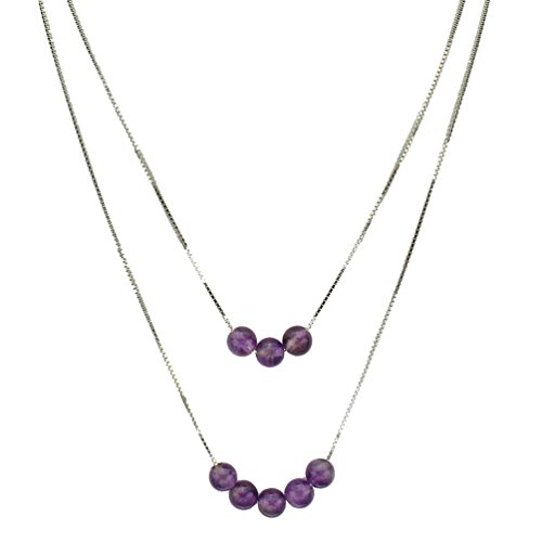 Smooth, polished 6mm amethyst (dyed) stone beads are suspended on each of the shiny 925 sterling silver box chains. A single 925 sterling silver lobster clasp and sterling silver extender chain for this two strand necklace make this necklace easy to wear. Inner strand is selected length while outer strand is approx 2 inches longer. Both strands are connected to a single 2 inch sterling silver extender chain. Sterling silver pieces imported from Italy. The natural properties and composition of mined stones define the unique beauty of each piece. Stones may have been treated to improve stability, durability or appearance. Gift box or organza pouch included, color or style may vary.Feature