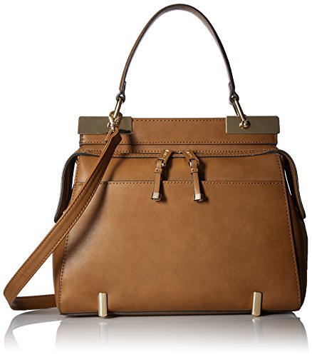 Top handle with metal detail and front zipper.