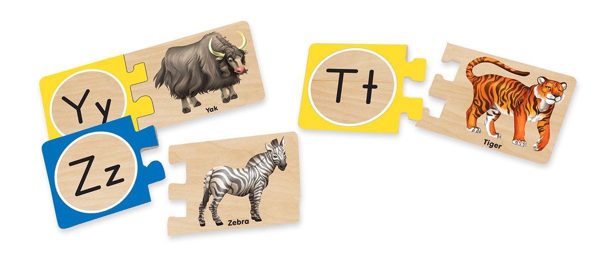 This alphabet has met its match! This alphabet box is filled with 26 two-piece puzzles, pairing upper- and lowercase letters with lifelike illustrations to match. Each wooden puzzle piece fits only with its correct match, so children can work by themselves to learn