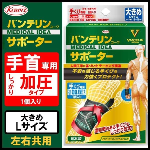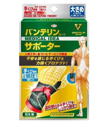 バンテリンコーワサポーター手くび専用にしっかり加圧タイプが新登場!パワーテーピングベルトを巻き付けることで手くびをしっかり守り、手くび、指の過度な動きを抑制します。また、面ファスナーを留める位置によって固定力の調節が可能です。 |