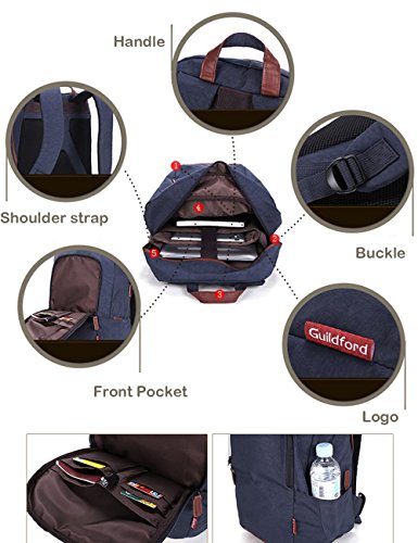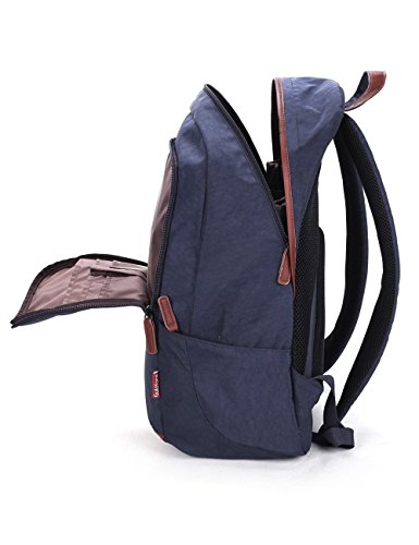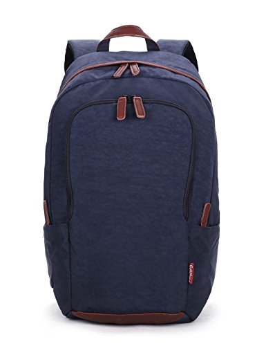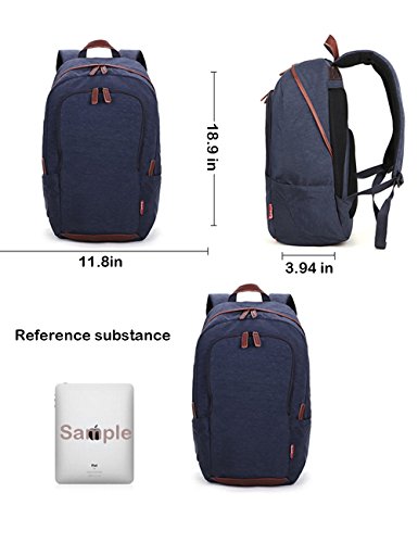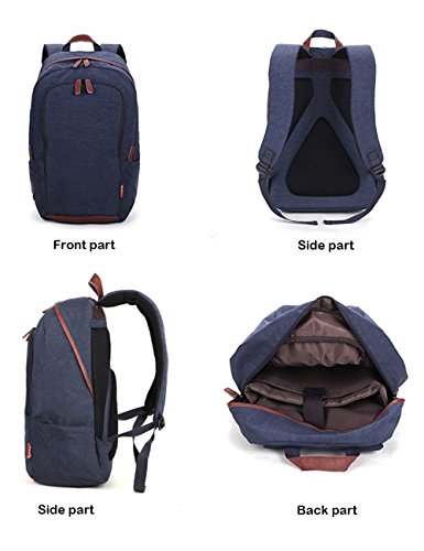 -. Feature : DURABLE. High quality washed oxford fabric features fluent zippers, water-resistant anti-tear and anti-scratch, but very lightweight, protects the bag from dirt and wet. / COMFORTABLE. Ergonomic adjustable and heavily padded straps offer extra back support for your shoulders and the padded back panel with breathable mesh fabrics provides great air ventilation, making it comfortable to wear even when loaded with all your gear. / ROOMY. Expansive interior main compartments hold books, files, folders and laptops (up to 15.6 inches); Organization panel stores your portable electronics, books and more. A convenient front pocket with plenty small pockets easy for you to get your keys, cards, notebooks, pens and other such small items. Two zippered side pockets on both sides can store your water bottle and umbrella / MULTIPURPOSE. Ideal for service as bookbag, schoolbag, casual daypack for daily use at school, work, weekend getaway, occasional travel, gyms, hiking etc. Nice size admirably suits college students, teen girls boys and adults. / STYLISH. Brown leather decorated with the zippers grasps, bottom and hanging hook, a matching for the overall contrast blue color design. Making it look stylish, fashionable clean and sophisticated to carry.