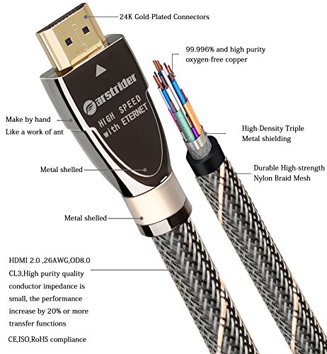 FARSTRIDER HDMI cable 2.0 Version Super High Quality with 3D Technology and Audio return(ARC)/CAT-2 HDMI Cable(Full 1080p/2160p approved),Full Ultra HD 4k support - 2160p (4096 X 2160 pixels),extended colour spaces such as xv Colour and Deep Colour.Supports 720p, 1080i,1080p and 2160p also Supports 4K x 2K Video and more color spare,Supports 54-Bit Deep Color for a Crispy Image.Supports True HD Dolby 7.1 and DTS-HD Master Audio,Support for all television with 1000Hz rates and above.