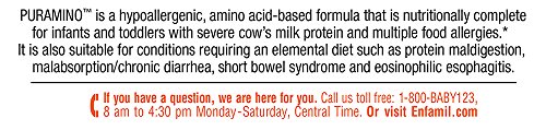 PurAmino is a hypoallergenic, iron fortified, amino acid-based infant formula used for infants and toddlers with severe cow's milk protein allergies, and other food allergies. It also is suitable for conditions such as protein maldigestion, malabsorption/chronic diarrhea, short bowel syndrome & eosinophilic esophagitis. It contains DHA & ARA, important fatty acid nutrients that nourish brain and eye development for your baby. PurAmino can provide a sole source of nutrition for infants up to age 6 months and provide a major source of nutrition through 24 months of age, when indicated. Normally, in feeding infants, gradual introduction of solid foods after 4–6 months of age is an important developmental as well as nutritional step. In cases of severe and multiple food allergies or intolerances, PurAmino is sometimes continued as a milk substitute in the diet of children. This and similar supplemental use of PurAmino in the diet beyond 24 months of age may make a significant contribution to maintenance of good nutrition. PurAmino is created by the maker of Nutramigen—the #1 recommended brand* for managing infants who are allergic to cow’s milk protein‡. ‡By pediatricians who recommend a specific formula. *Enfamil is the #1 pediatrician recommended brand of Infant Formula - QuintilesIMS, using the ProVoice Survey fielded from October 1, 2016 to September 30, 2017.Feature