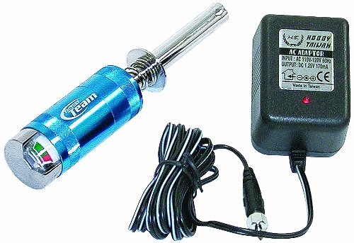 This is the Associated Factory Team rechargeable Glow Igniter with Wall Charger. FEATURES: Blue aluminum construction Battery condition meter Replaceable sub-C battery YOU WILL RECEIVE: One glow igniter with rechargeable sub-C battery One wall charger REQUIREMENTS: Charging of the igniter SPECIFICATIONS: Total length: 5 1/2" (139.7mm) Shaft length: 2-1/4" (57mm) Diameter: 1" (25.4mm) COMMENTS: This is a standard size igniter and will not work with some engines which have a deep head. With those heads a standard igniter will not reach the glow plug. For deeper heads use (GPMP2011) dda 08/10/03Feature