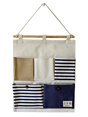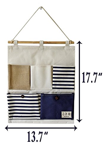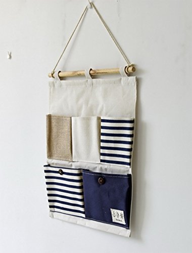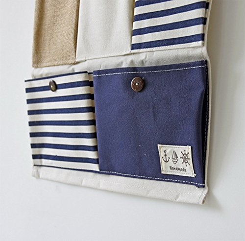 Linen Cotton Fabric 5 Pockets Wall Hold Pocket Household Back Door Pouch (Blue Stripes,13.7x17.7In)