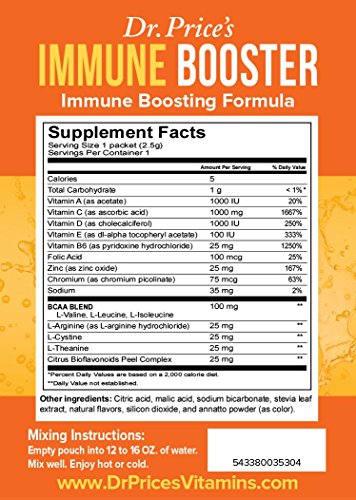 -. Binding : Health and Beauty -. Brand : Dr. Price's Vitamins -. Color : Orange -. Department : mens -. EAN : 5433800350078 -. Feature : THE HIGHEST QUALITY IMMUNE SUPPORT FORMULA. Unlike many other supplements, Dr. Price's Immune Booster contains a UNIQUE blend of Branched Chain Amino Acids which are the building blocks necessary for the body to manufacture more complex proteins necessary for the cells of the immune system to have a rapid and complete response. / NON-GMO, GLUTEN FREE & NO SUGAR! 100% Naturally Sweetened with Stevia Leaf Extract. / EAST TO USE! Convenient to-go packets that you can take anywhere. / BIO-AVAILABLE. Powdered water-soluble formula that mixes with liquid for FAST and EASY absorption. / 1000mg of Bio-Available Vitamin C PLUS Zinc & Chromium -. IsAdultProduct : 0 -. Label : Dr. Price's Vitamins -. LegalDisclaimer : These statements have not been evaluated by the Food & Drug Administration. This product is not intended to diagnose, treat, cure or prevent any disease. -. Manufacturer : Dr. Price's Vitamins -. MPN : DPV049 -. PackageQuantity : 30 -. PartNumber : DPV049 -. ProductGroup : Health and Beauty -. ProductTypeName : HEALTH_PERSONAL_CARE -. Publisher : Dr. Price's Vitamins -. Studio : Dr. Price's Vitamins -. Title : Immune Booster: Bioavailable Vitamin C, Zinc, Chromium & Branched Chain Amino Acids (30 powder packets) Drink Mix | Dr. Price's Vitamins