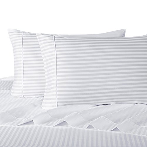 Stripe White Queen Size Sheets, 4PC Bed Sheet Set, 100% Cotton, 300 Thread Count, Sateen Striped, Deep Pocket, by Royal Hotel
