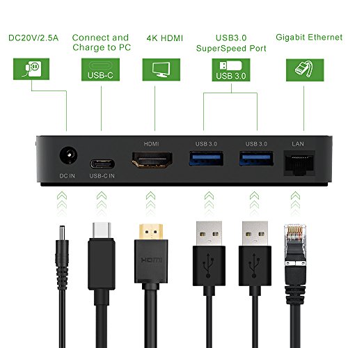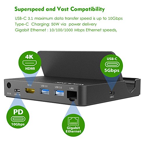 -. Feature : CHARGE & SYNC AT ONCE - This dock easy connects and charing for your laptop,like your MacBook, ChromeBook Pixel via a single USB-C port and gives you an HDMI port, a Gigabit Ethernet port, two USB 3.0 ports, a USB-C downstream port. / ADD AN 4K HDMI ADDITIONAL MONITORS - Laptop docking station provide Mirror or extend the display of your laptop to your monitor, projector, or TV in up to 4K UHD (3840×2160@30Hz) resolution, ideal for gaming or streaming movies. / SUPERSPEED PORTS - A USB-C (to host) data transfer speed is up to 10Gbps,20V/2.5A (50W) power delivery to your laptop.A Gigabit Ethernet port provides access to superfast 10/100/1000Mbps network speeds.Two USB 3.0 Ports speed up to 5Gbps for more peripheral devices like keyboard, thumb drive. / PORTABLE AND FULLY COMPATIBALE - Aluminum material, foldable cover, stronger shockproof pad,the flip style design makes the Mini Dock so portable,and you can take it go and create a workstation wherever you need. Microsoft Windows/Mac OS X/ Chrome OS and hardware system comply with the USB-IF Power Delivery specification. / SATISFACTION GUARANTEED - This is a high performance docking station,To use the HDMI output port,please make sure the USB c of your device is USB C Gen 2 ports and support the VEST ALT MODE.If you not work well with it,we provide an 18-month warranty on your purchase of our USB C mini docking station.