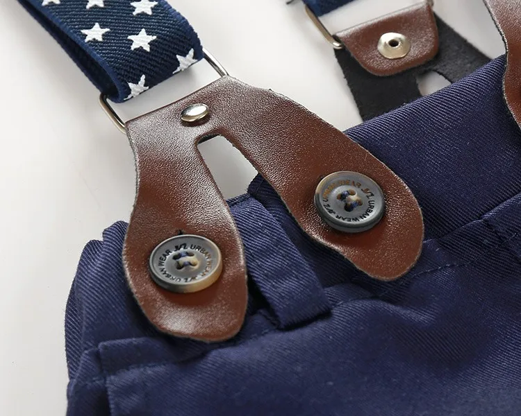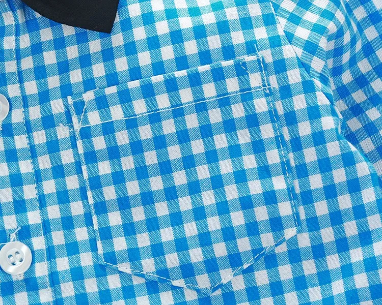 2016新しいブルーチェック柄男の子服シャツで弓+カジュアルパンツwtih送料ストラップ赤ちゃん男の子ファッション服セット新生児服