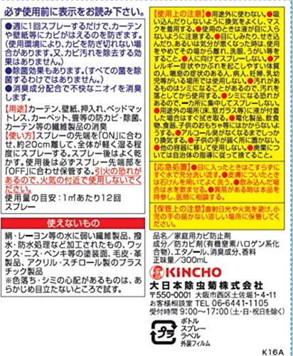 週に1回スプレーするだけで、カーテンや壁紙等にカビがはえるのを防ぎます。(使用環境により、カビを防ぎ切れない場合があります。又、カビ汚れを除去する効果はありません。)