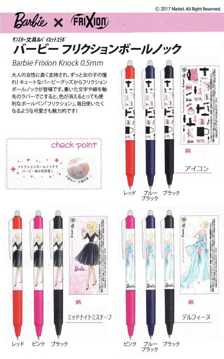 大人の女性に高く支持され、ずっと女の子の憧れ! キュートなバービーグッズからフリクションボールノックが登場です。書いた文字や線を軸先のラバーでこすると、色が消えるとっても便利なボールペン「フリクション」。毎日使いたくなるような可愛さも魅力的です!