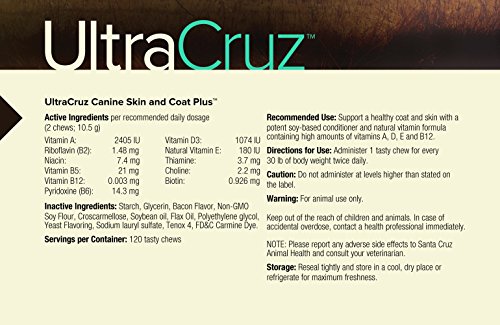 -. Binding : Misc. -. Brand : UltraCruz -. EAN : 0810500022668 -. Feature : Delicious bacon flavored chews / Also contains biotin, an important vitamin that supports healthy skin and coats in dog / Easy-to-give as healthy, tasty chews / Administer 1 tasty chew for every 30 lb of body weight twice daily / Supplied as 120 tasty chews. -. Label : Santa Cruz Animal Health -. Manufacturer : Santa Cruz Animal Health -. PackageQuantity : 120 -. ProductGroup : Pet Products -. ProductTypeName : PET_SUPPLIES -. Publisher : Santa Cruz Animal Health -. Studio : Santa Cruz Animal Health -. Title : UltraCruz Dog Skin and Coat Plus Supplement, 120 chews -. UPC : 810500022668
