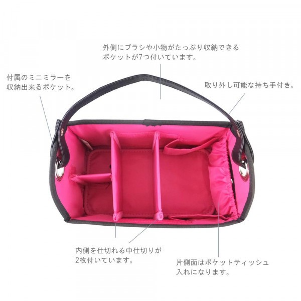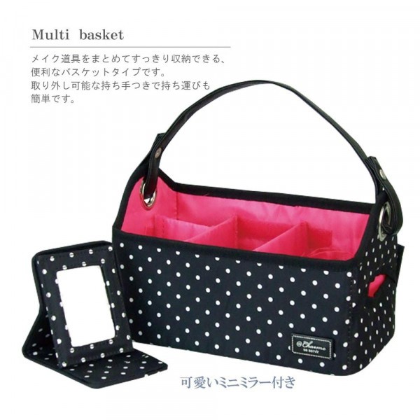 fk094igrjsメイク道具をまとめてすっきり収納できますミニミラー付き サイズ 幅24×奥行き13×高さ15cm 個装サイズ:24×13×15cm 重量 個装重量:384g 仕様 持ち手:取り外し可能 仕切り:内側を4つに仕切る中仕切り2枚 外ポケット:7個 内側:ギャザーポケット 付属品 ミラー(W8×D0.9×H11cm) 生産国 中国 メイク道具をすっきり収納 メイク道具をまとめてすっきり収納できますミニミラー付き