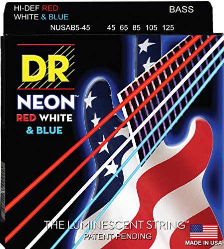 DR Strings NUSAB5-45 Coated Nickel 5-String Bass Guitar Strings, Medium, 45-125, Neon Red/White/Blue
