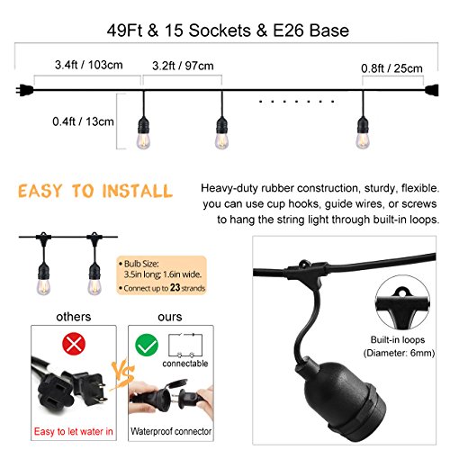 2. There is 15 hanging sockets of the string lights, and bulb space is 3.2ft to prevent striking and damage when hanging outside.