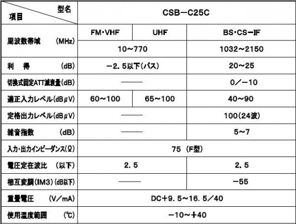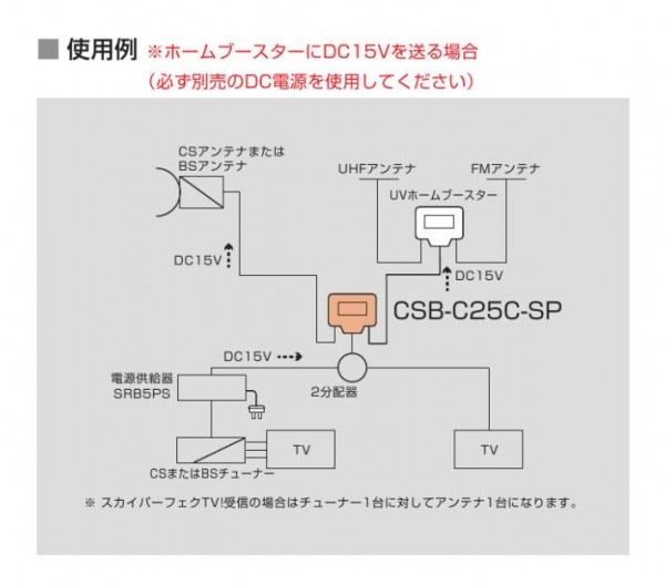 外側は樹脂ケースで防滴構造で内部は板金ケースで電波の漏洩、飛び込み防止に対応したシールド構造です。チューナーなどからの供給電源で動作します。 |