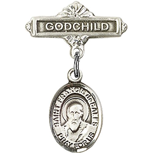 -. Title : Sterling Silver Baby Badge with St. Francis de Sales Charm and Godchild Badge Pin 1 X 5/8 inches