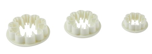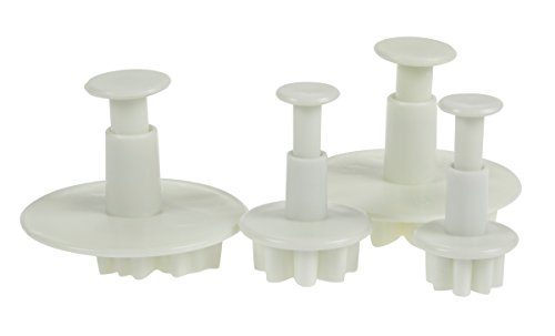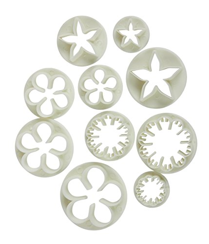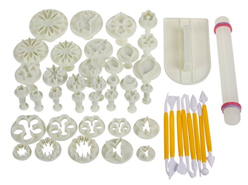 - FULL SET: 1. Includes: 4 daisy plungers, 4 blossom plungers, 3 star plungers, 3 heart plungers, 3 sunflower plungers, 3 butterfly shapes, 3 veined leaves, 3 laurustinus, 3 elegant flower shapes, 3 calyx cutters and 4 plum flower cutters, 8 double-ended sculpting tools pieces, one 8.75” fondant plastic rolling pin and 1 cake smoother
