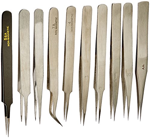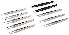 Product DescriptionSet of 10 very economical stainless steel tweezers in the shapes of popular Swiss precision tweezers.0